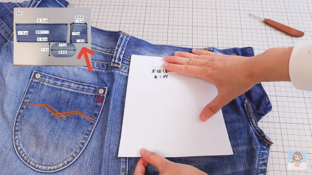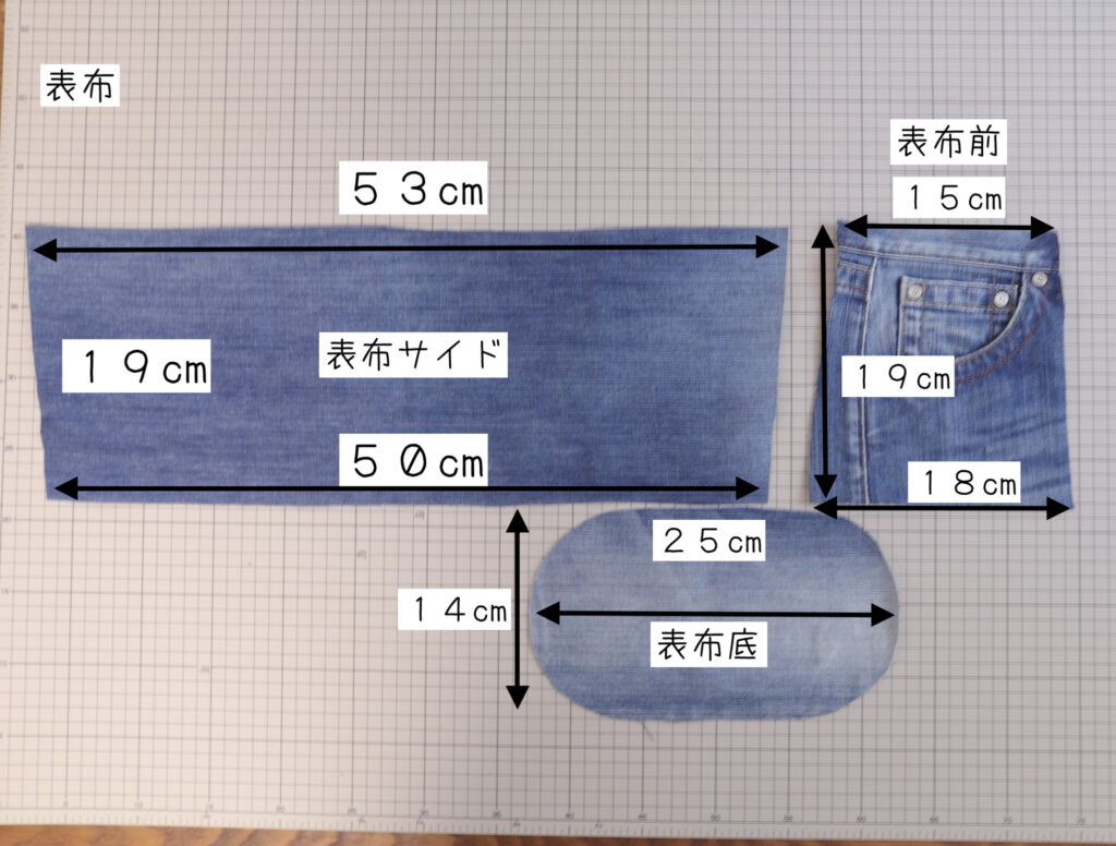 タグやポケットどの部分を前や後ろにするか決めて裁断しましょう