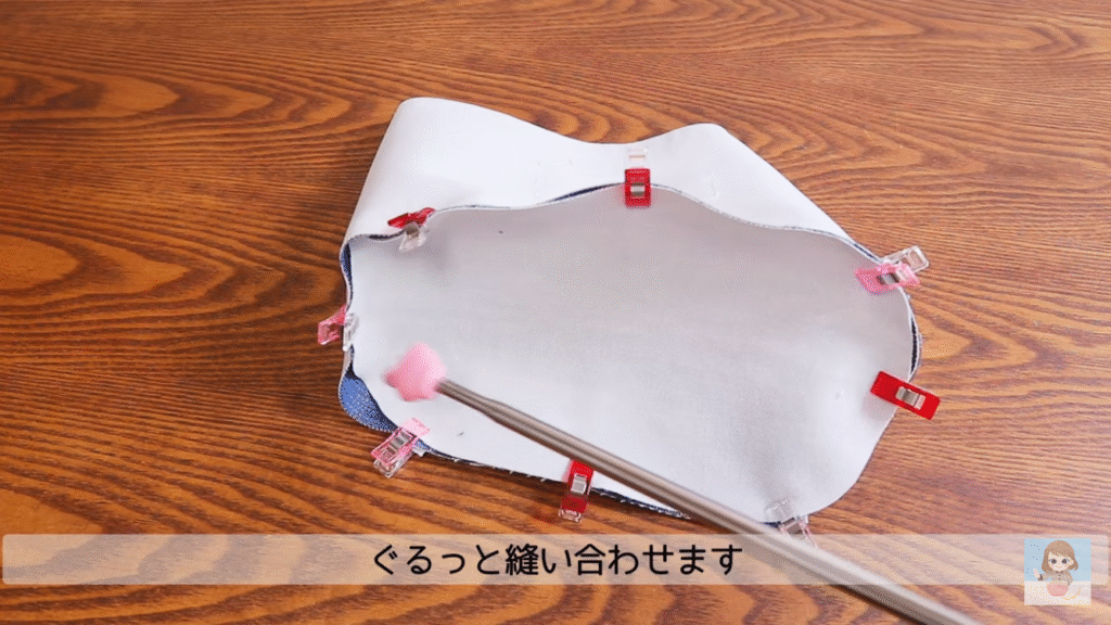返し縫い部分を底に8cm残し、同様に縫い合わせます